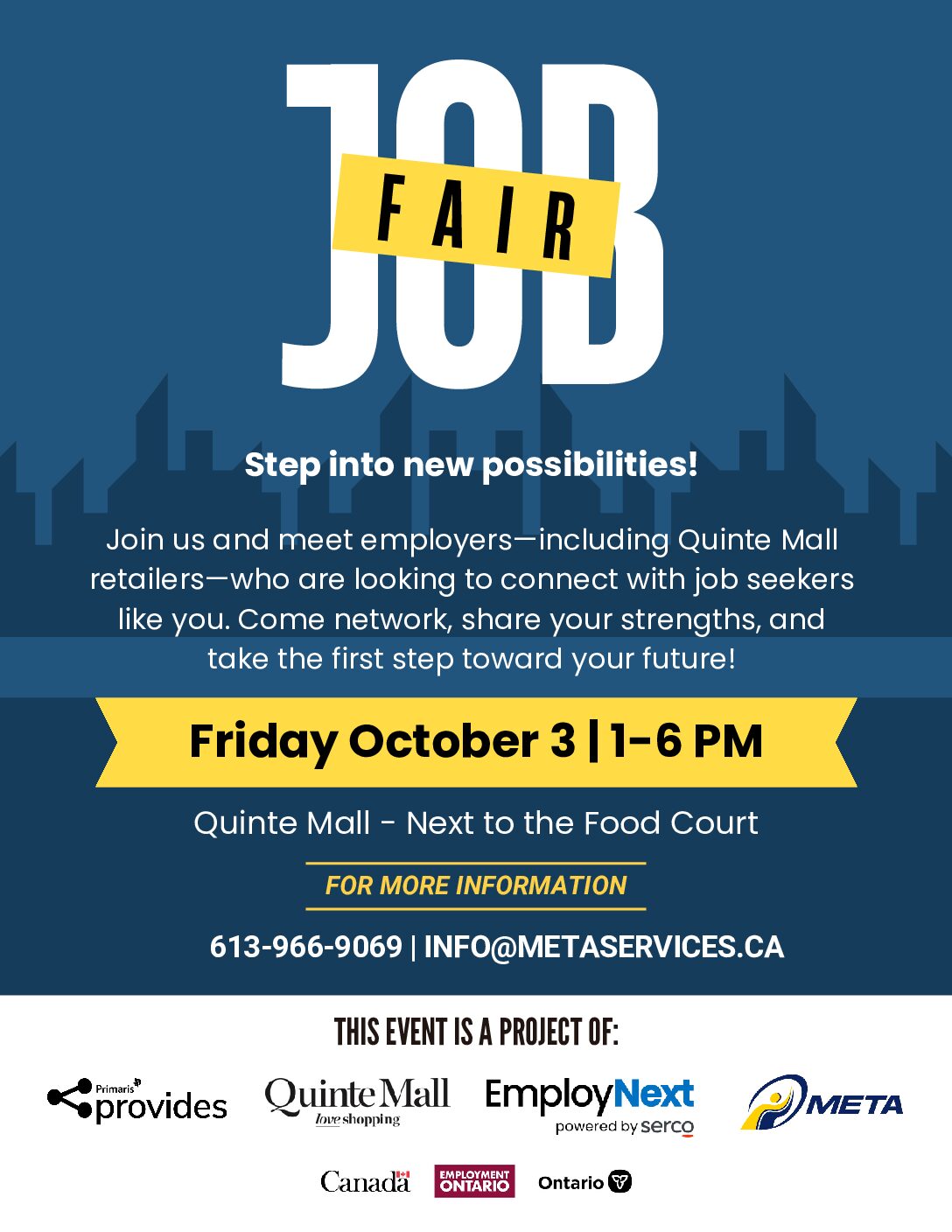 Step into new possibilities with the Quinte Mall Job Fair! Meet with employers from the Quinte Mall who are looking to connect with job seekers! Network, share your thoughts, and take the first step towards your future!